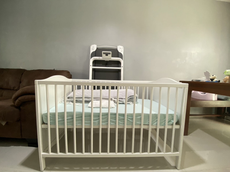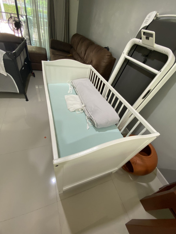 เตียงเด็กอ่อน ikea ปรับได้ 2 ระดับ ยกชุดพร้อมเบาะนอนและผ้าปูสีฟ้า,ขาว ikea, bumper กันกระแทก ส่งต่อ 3,200.- ค่าจัดส่งตามจริงหรือรับสินค้าเอง