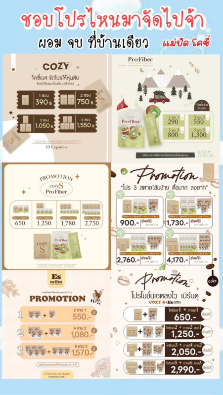 รายละเอียดสินค้า โคซี่ 1 ซอง 390 บาท(มีค่าส่ง 50บาท) ทานได้ 10 วัน เน้นคุมหิว อิ่มนาน เร่งการเผาผลาญ กระชับสักส่วน กาแฟ ES 1 ห่อ มี 10 ซอง 290 บาท โปร 2 แถม 1 ราคา 550 บาทจ้า เน้นคุมหิว ค่ะ โปรไฟเบอร์กีวี่ 1 ห่อ มี 5 ซอง โปร 1 แถม 1 ราคา 290 บาท เน้นเรื่องขับถ่าย พุงยุบ ลดบวมค่ะ ไฟเบอร์สตอเบอรี่ 1 ห่อ มี 5 ซอง โปร 1 แถม 1 ราคา 290 บาท เน้นเรื่องขับถ่าย พุงยุบ ลดบวมค่ะ