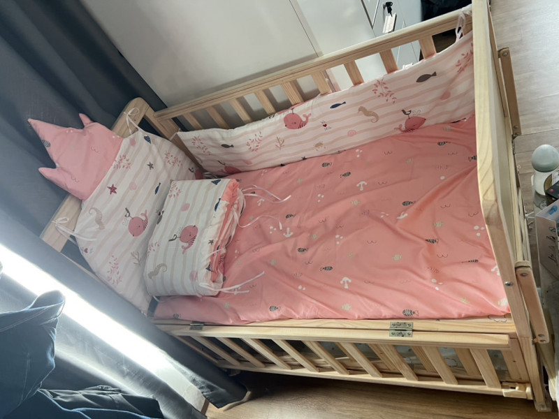 เตียงนอนไม้เด็ก + ชุดที่นอนกันกระแทก + มุ้ง ส่งต่อ 1300 รวมส่ง สภาพนางฟ้า 90%