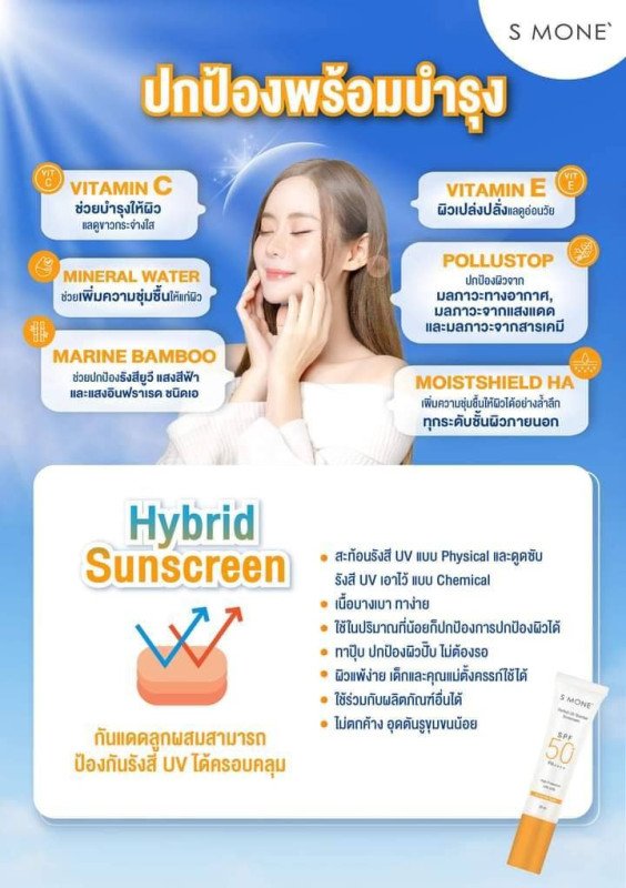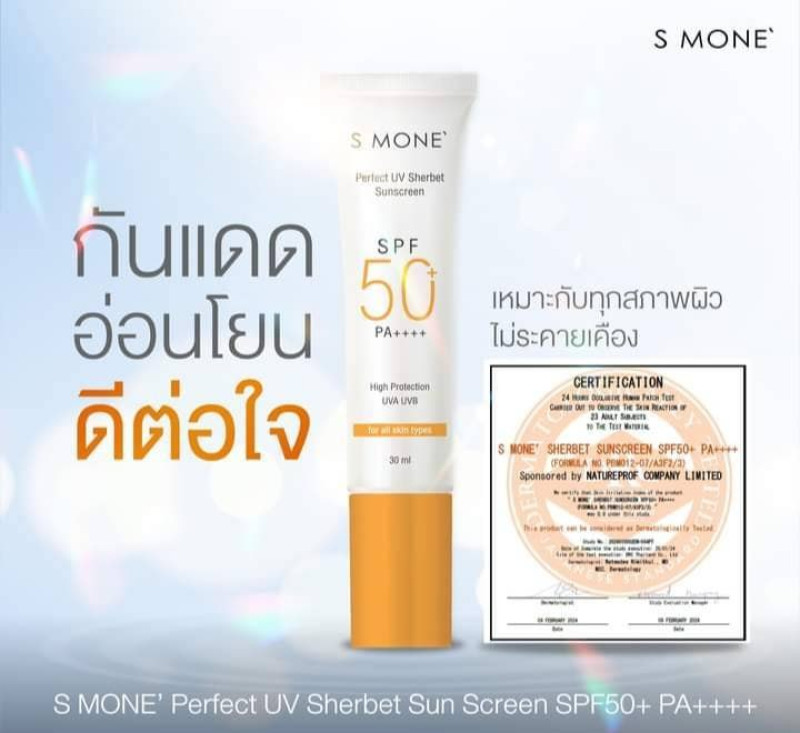 นวัตกรรม" Pollustop " ที่อยู่ใน S MONE' Perfect UV Sherbet Sunscreen SPF50+ PA++++ คือ Biosaccharide gum-4 เป็น Natural Polymer เกิดจากกระบวนการทาง Biotechnology ได้รับรางวัลจากประเทศจีน นวัตกรรมด้าน Personal Care & Cosmetic ที่มีคุณสมบัติเป็น Anti- pollution & Second Skin ป้องกันผิวจากการทำลายของ PM2.5 และ รังสียูวี โดยมีหน้าที่ สร้างเกราะป้องกันผิว "Shielding effect" มีลักษณะเป็นฟิล์มบางๆ ที่มีประจุลบ เคลือบบนผิว ซึ่งช่วยปกป้องผิวจากมลภาวะ 3 ประการหลักๆ ที่อาจเจอในชีวิตประจำวัน 1. มลภาวะทางอากาศ เช่น อนุภาคคาร์บอนและโลหะหนัก เป็นต้น 2. มลภาวะจากแสงแดด 3. มลภาวะจากสารเคมี . THE WAY TO PERFECT SKIN สู่ผิวสวยสมบูรณ์แบบด้วย S MONE' ราคา 820 (จัดส่งฟรี)
